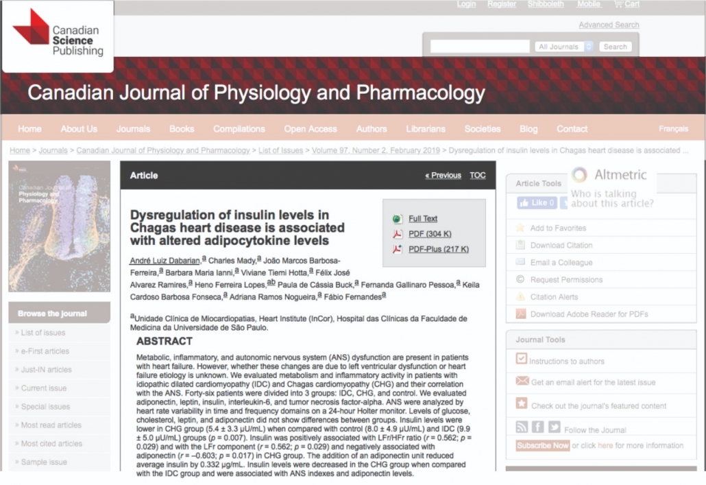 Esse estudo foi realizado no InCor com 60 pacientes, com e sem doença de Chagas. Percebemos uma relação positiva da insulina com a leptina e a atividade do sistema nervoso simpático e negativa com a adiponectina.